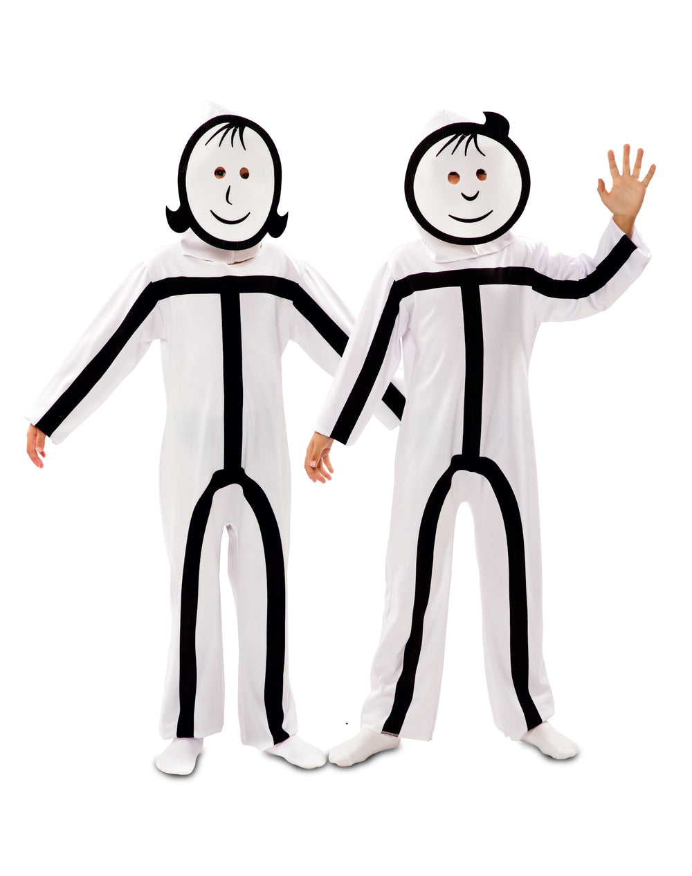 To embody a video game ersonnage This Stickman costume has 2 masks and a suit. The lide fabric jumpsuit is white with a black stick drawing of a man. Two white masks are also present. One depicts the face of a stick man and the other of a stick woman. This kid stick man costume will be perfect for a video game themed party.