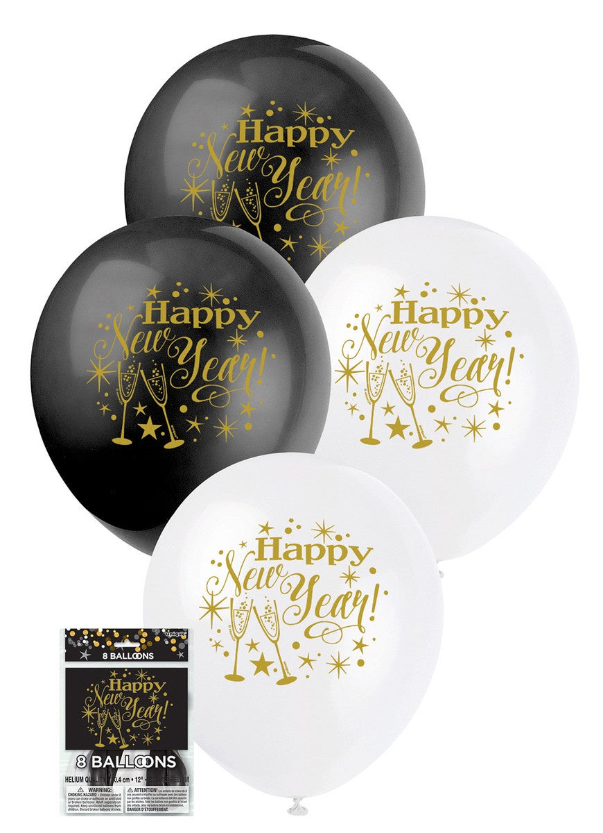 GLITTERING NEW YEAR 8 X 30CM (12") PRINTED LATEX BALLOONS