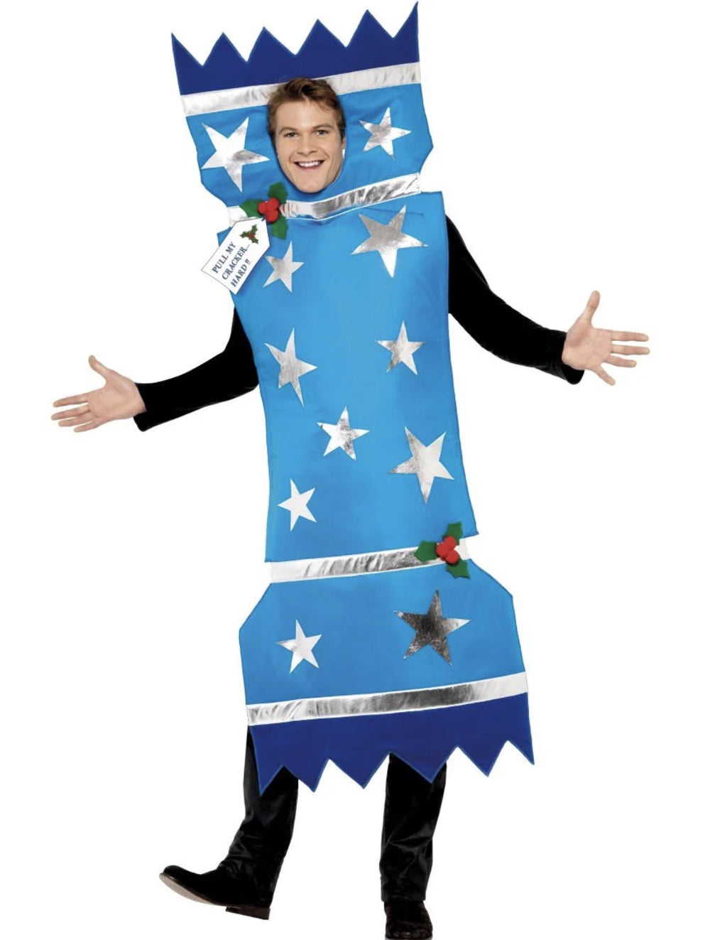 We have a cracker of an idea for a unique costume at your next Christmas or New years theme event. Our Cracker Costume, is the perfect costume for Christmas This Costume includes a blue cracker shaped tabard with silver stars and stripes on the front and an opening to place your face. The tabard has Velcro at the back, making this costume easy to take on and off. An elasticated strap helps secure this costume to your head and keeps the costume in place. Completing this fun costume are Holly decorations and a label saying 'PULL MY CRACKER...HARD! Please note: This costume only comes in a Medium Male size as part of our range. The approximate size measurements for this costume are: Chest 38- 40 inches or 97-107 cm Waist is 32-34 inches or 81-86 cms.