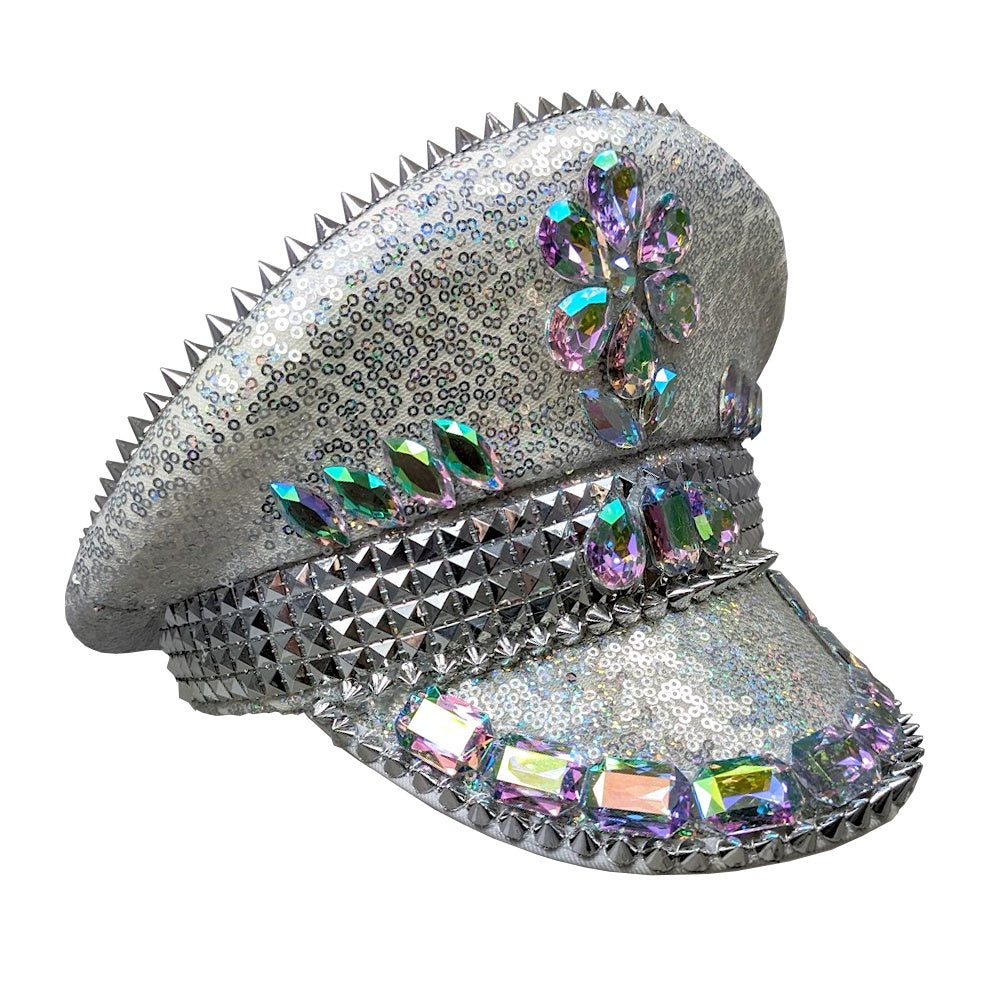 Handmade Silver sequin military style hat with crystal embellished decor. Perfect for adding that extra sparkle to your party outfit, great for Raves, Burningman, festivals and Clubbing events.