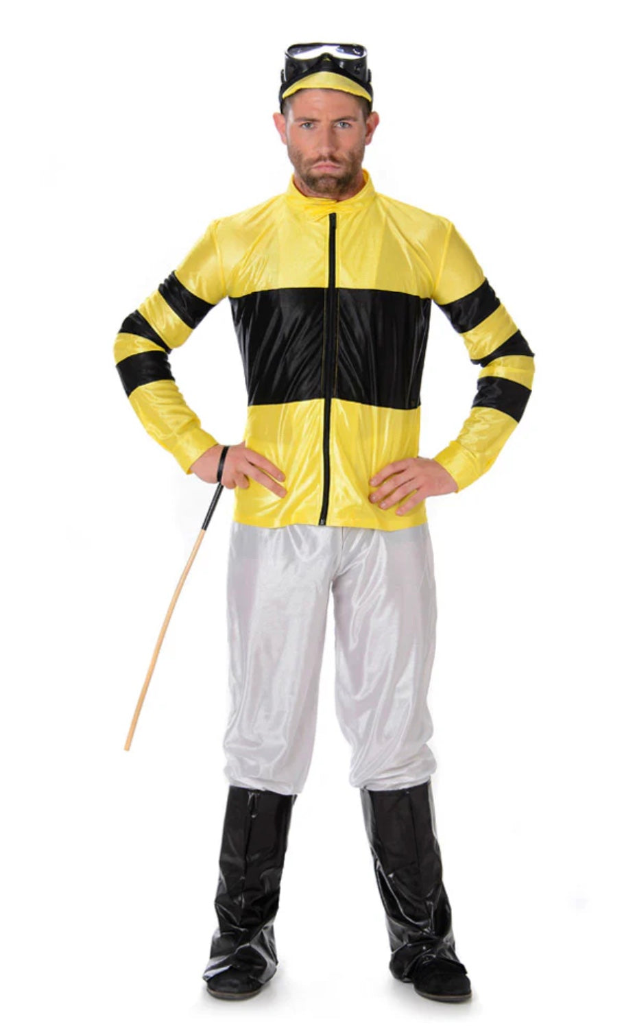 This Jockey Yellow And Black Mens Costume is simply perfect for a Melbourne Cup or costume party. A cap, goggles, jacket, pants and boot covers are included, simply add a riding crop to complete the look!