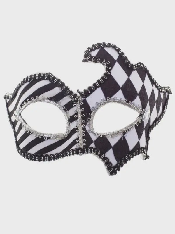 If you’re one who loves to show off some flair and style, then we know this also applies to your outfit choices for dress up parties too! Go outside of the box for your upcoming masquerade party with this black and white harlequin style masquerade mask! Explore your humorous side for the night, whilst still remaining a handsome, mysterious character. This mask features different patterns on each side to represent your duality and is held onto your head with glasses arms, which is very handy and will make sure your mask doesn’t come off and ruin your enigmatic vibe!
