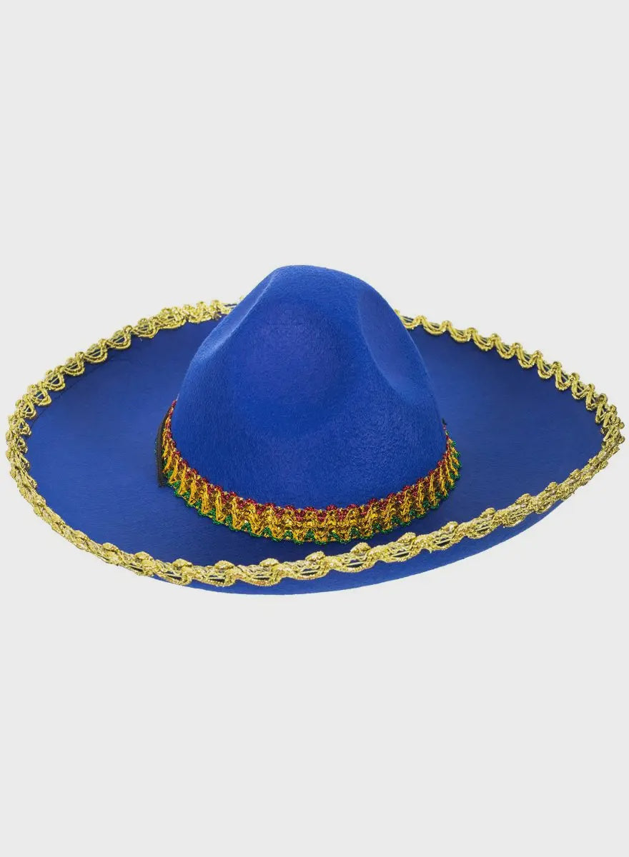 Don’t forget about the little ones when it comes to Mexican Fiesta time! This cute large blue and gold kid’s Mexican sombrero hat is a great costume accessory for any Mexican themed dress up!