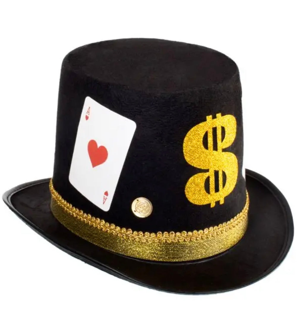 If you play your cards right, you’ll rule the block as you strut down the street wearing this hat. Featuring a large gold dollar sign at the front and playing cards attached to the sides, this top hat is ideal for a pimps and pro's party. Everyone knows Mac Daddy outfits for their flamboyant style and this hat is exactly what you need to add a finishing touch to your look. Are you are playa or do you have your head in the game? Let the chips fall on casino night and put your reputation to the test.