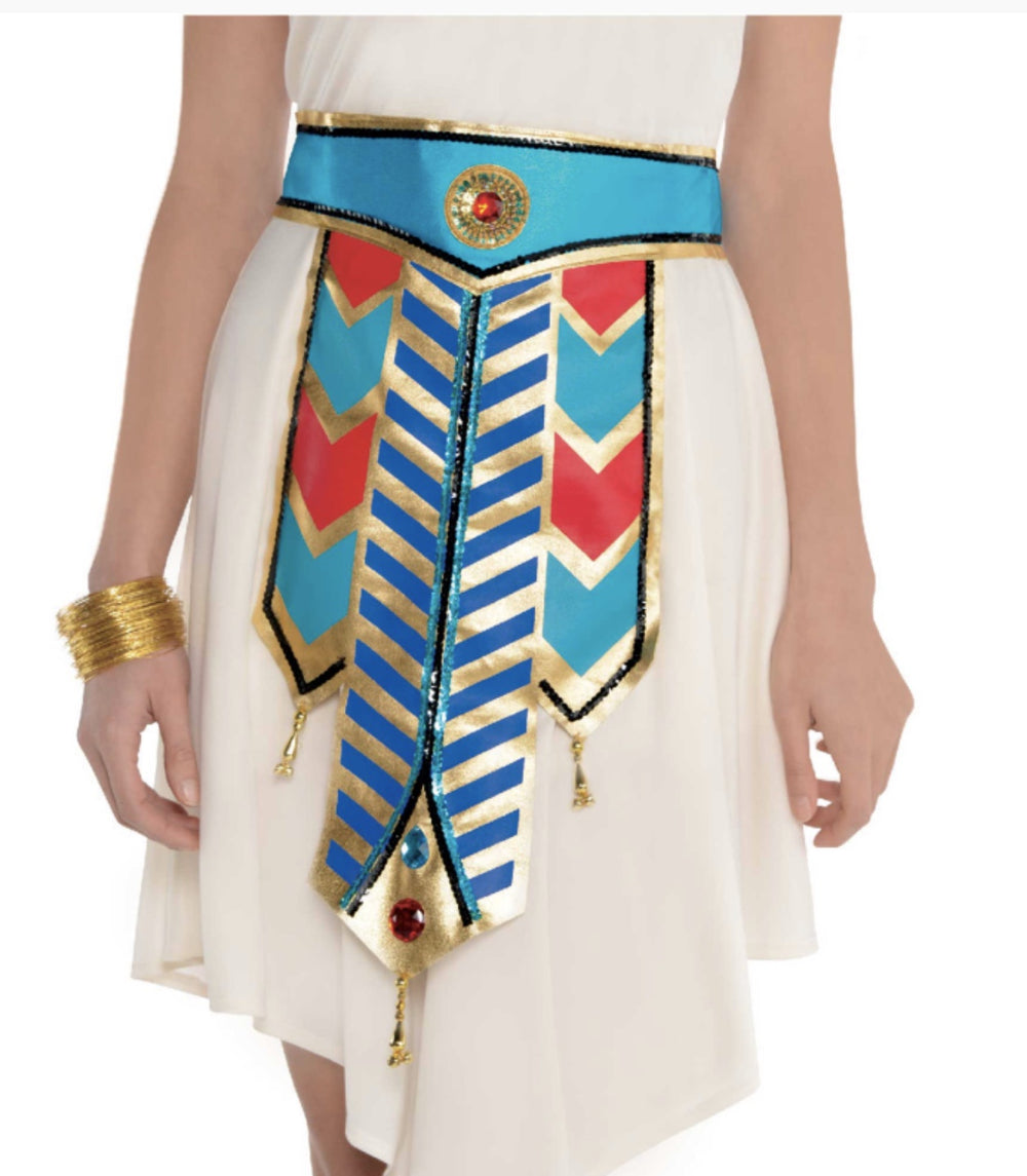 Show off your divine style and become the god or goddess you are with this stunning Goddess Belt. Constructed with a striking turquoise blue belt and decorated with a black and metallic gold edge, this piece will take your look to the next level. The attached, decorative strips hang down from the front of the wearer's waist and feature a unique striped design of deep carmine pink, metallic gold, black, blue, and turquoise, plus red and blue faux gemstones and small gold tassels. With this belt, you'll feel like royalty—whether you're dressing up a toga, completing a mythology costume, or adding some flair to a Greek, Roman, or Egyptian-inspired look.