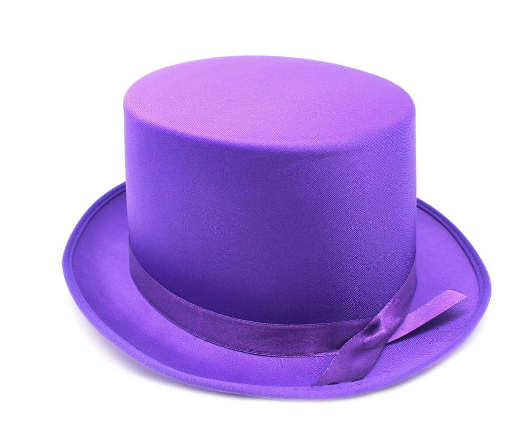 Our Purple Satin Top Hat is perfect for all those ladies and gents of class. Use it to complete your cabaret outfit or to compliment your tux or suit. It also reminds us a little of a certain chocolate maker named Willy!
