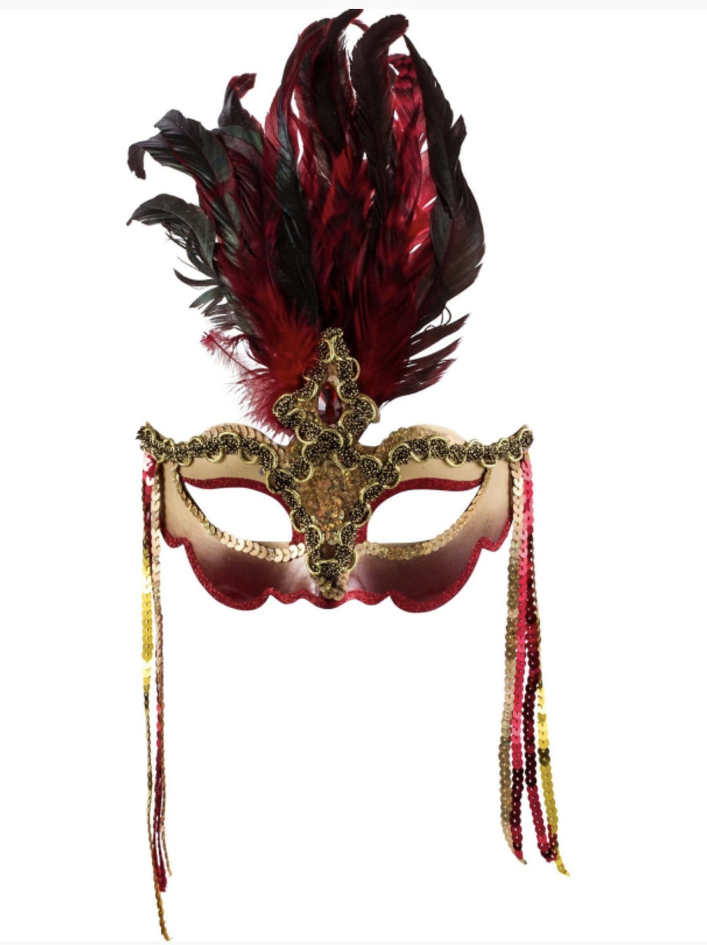 You'll look glamorous in our Venetian Luxury Feather Eye Mask. The gorgeous accessory features a luxury renaissance era Venetian mask featuring a gold and red mask, ornate gold highlights around a red teardrop red gemstone, gold sequin around the eyes, cascading gold and red sequin on either side and to top it off the mask is attached to a beautiful bloom of red and black feathers. Check out our range of renaissance and masquerade inspired accessories and costumes for a coordinated look!