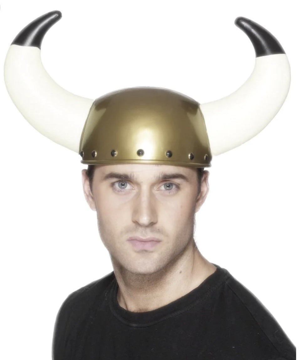 Get ready to storm your next International or Medieval party dressed as a Viking Warrior when you top off your Nordic outfit with this gold horned Viking helmet.