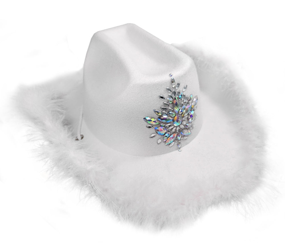 WHITE FESTIVAL HAT W/CRYSTAL DECOR & WHITE FUR TRIM