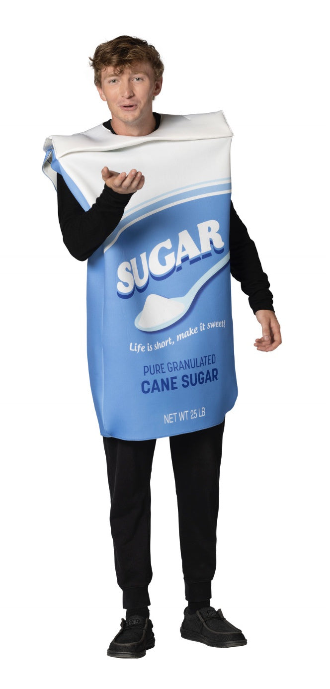 Transform into the sweetest treat this season with our Granulated Bag of Sugar Costume! It’s the perfect way to "sugar-coat" your look! Packed with personality and sweet style, you'll be the life of the party, with everyone sugaring you with compliments. This costume includes a foam tunic in the shape of a granulated bag of sugar and is printed on the front only with a polyknit back. One size fits most adults.