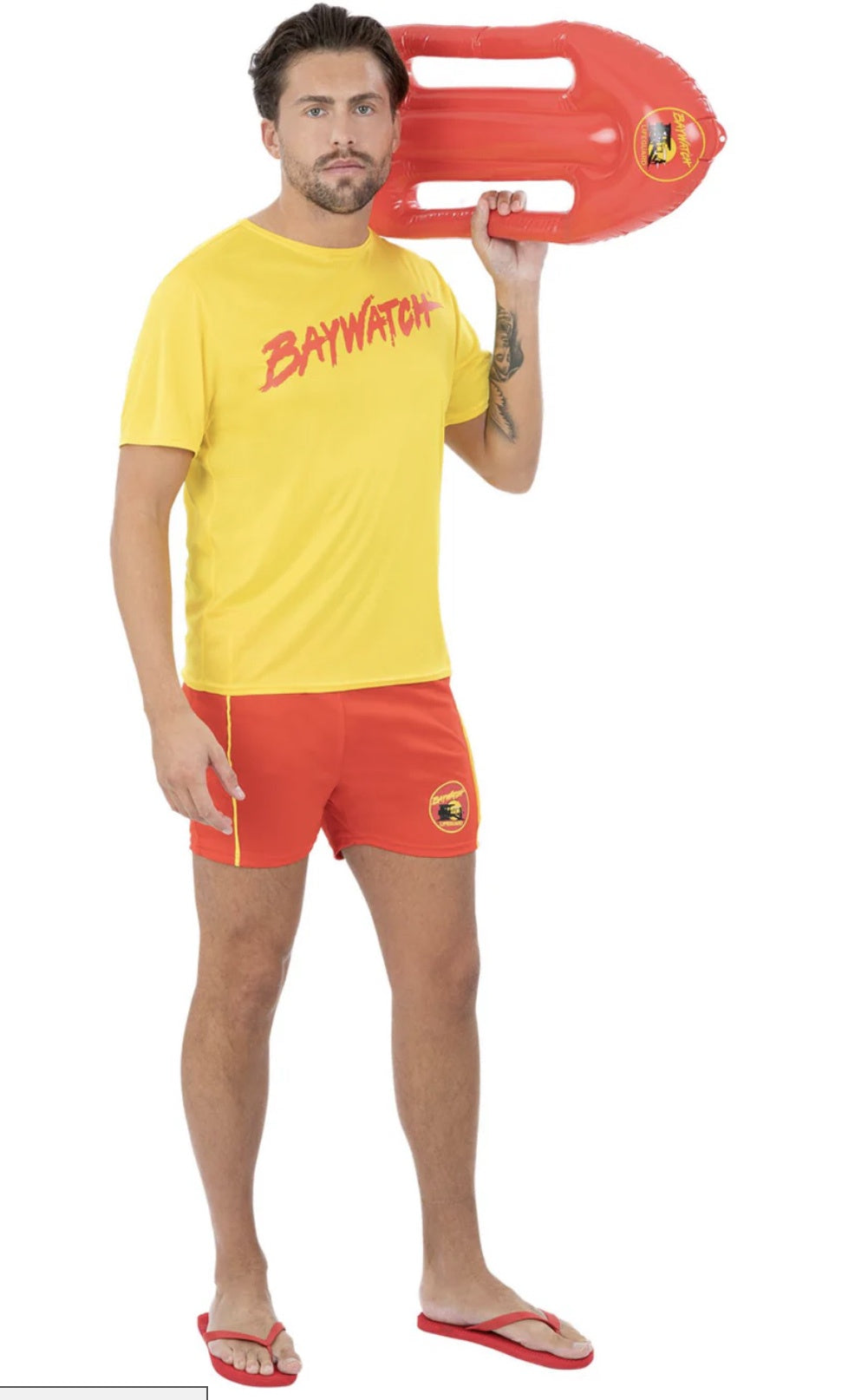 The ensemble is completed with striking red and yellow shorts, adorned with the Baywatch logo on the left leg, ensuring you look the part for any beach-themed event. To elevate your look, consider adding our Baywatch Floats, although please note that they are sold separately.
