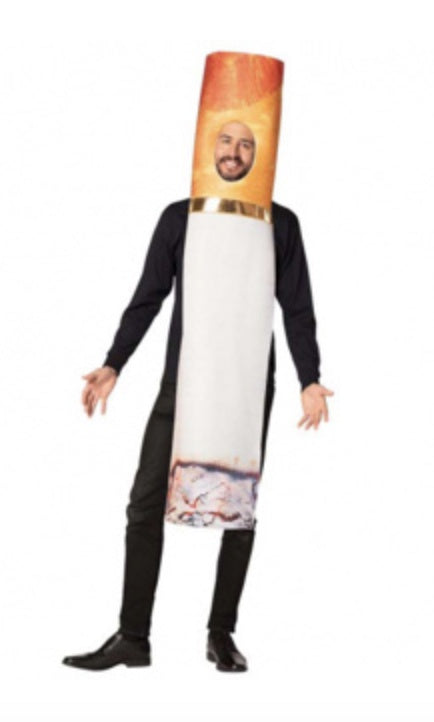 This Cigarette Costume includes a foam head in tunic with an open face for easy drinking and eating.
