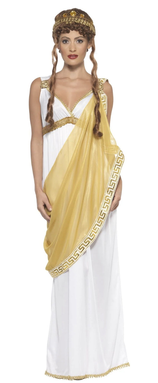 Catch the attention of all the Gladiators at your next Greek or Roman costume party in this Helen of Troy Goddess fancy dress costume. Become the most beautiful woman in the world but be careful not to start a war! Stand out from the crowed when you wear this beautiful Greek toga for women.