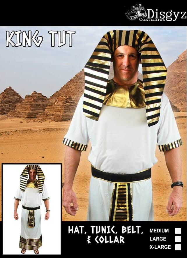 Men's King Tutankhamun Costume includes black and gold pharaoh hat, white tunic, black and gold belt, and gold collar.