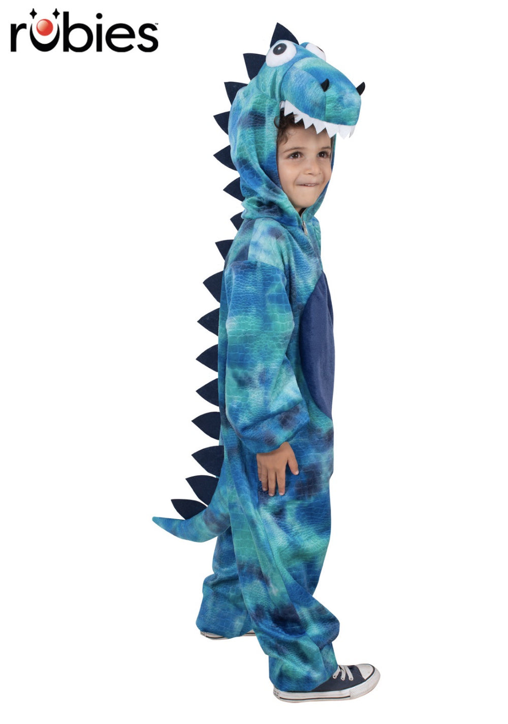 • Jumpsuit features an attached plush head with fibre filled 3D dinosaur facial features and felt triangular scales from head to tip of tail