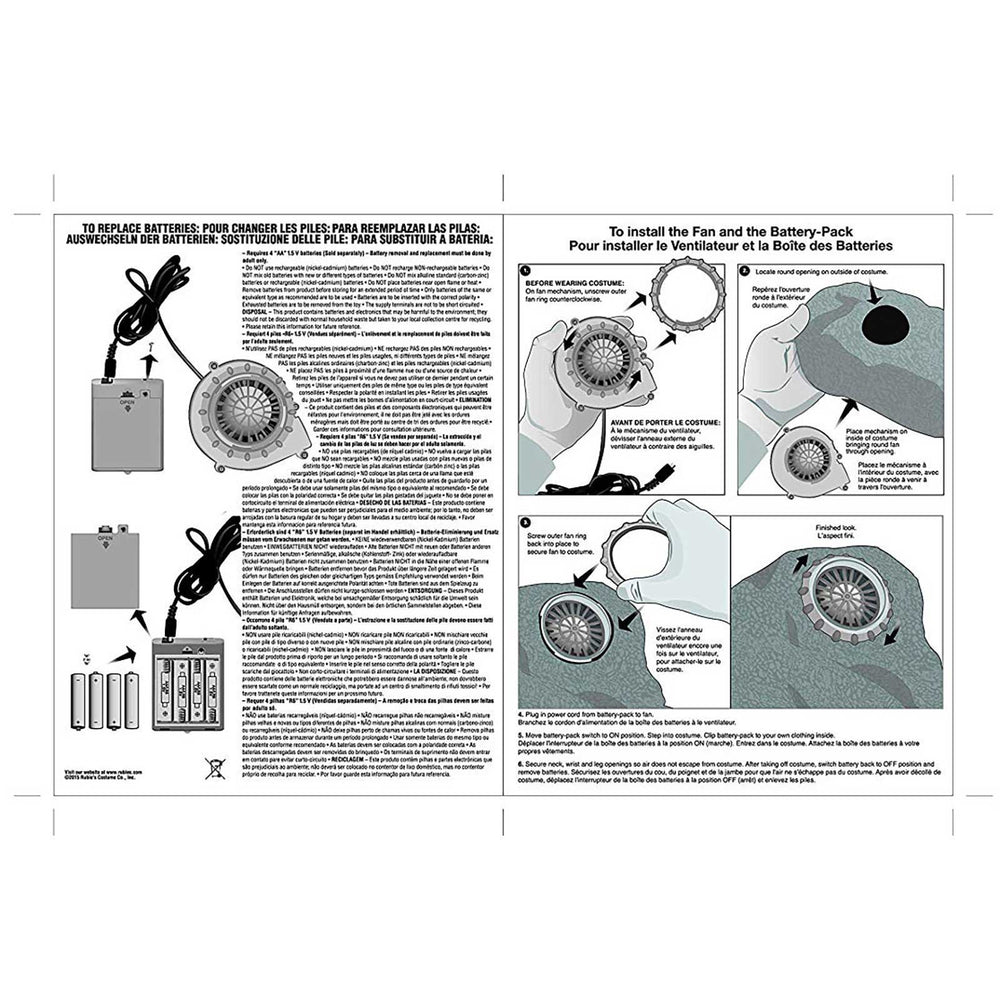 - Battery pack requires 4xAA batteries (not included). Fan sits over right hip within costume