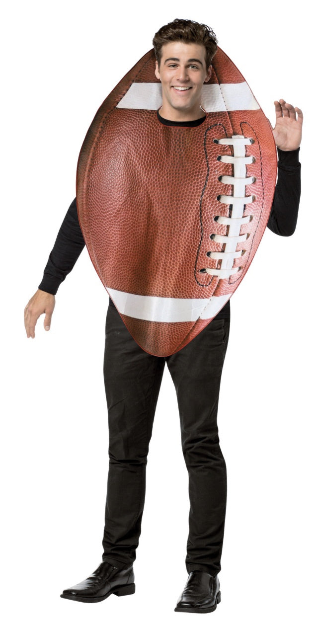 Doesn't get better than All American Football! Take it up a notch and bring your A game to the stadium, event or Halloween party wearing this Get Real Football Costume. This costume includes a tunic and is printed on the front only in the likeness of a football. One size and fits most adults.