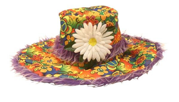 Far out, this costume hat is a psychedelic trip! Complete your hippie outfit with an out of this world 70’s costume accessory! This large-brimmed hat features rainbow flower power print with purple fur trim and a pretty daisy flower to finish.