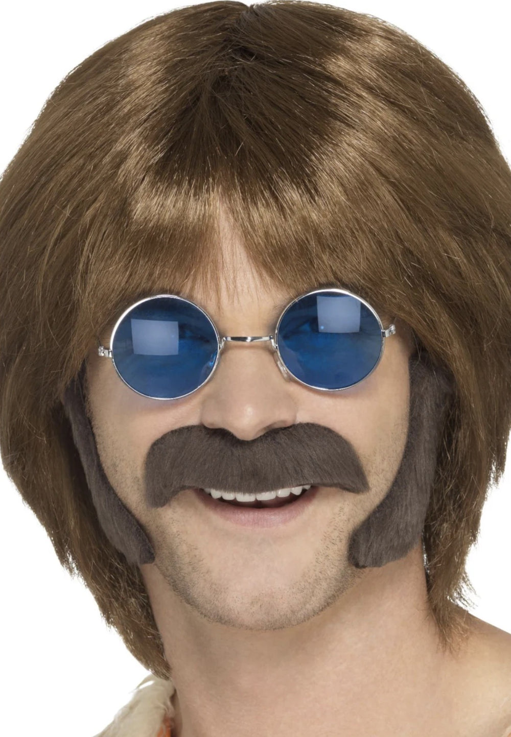 Hippie Disguise Set, Brown, with Porkchop Sideburns & Moustache.