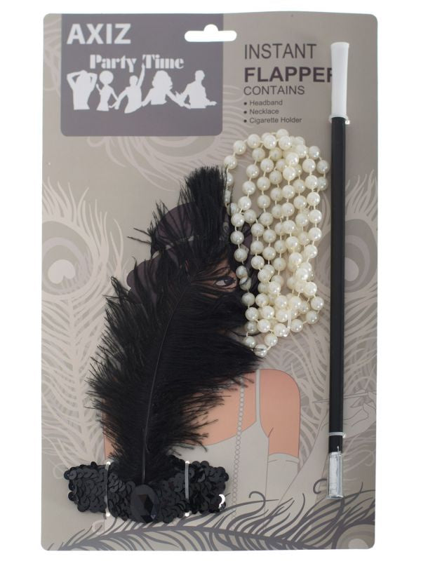Women's 1920's flapper dress up accessory kit to match a wide variety of Gatsby dresses and roaring twenties themed fancy dress costumes. This wonderful 3 piece flapper costume set includes a black feather headband, cigarette holder and fake pearls necklace. See below for further description.