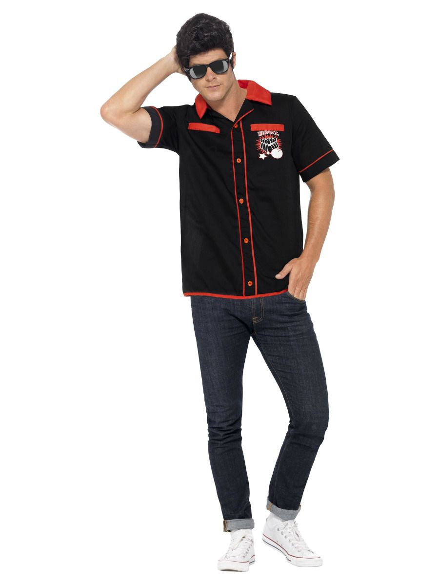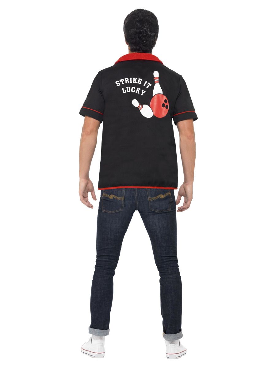 Our Smiffy's 50's Bowling Shirt includes a black shirt-sleeve shirt with red trim and a printed set of pins with a bowling ball on the front Printed onto the back of the shirt is a picture of two bowling pins, a red ball and 'STRIKE IT LUCKY' printed on the back Don't forget to add a pair of our 50's style specs and a Teddy Boy Flick comb to complete your 1950's look