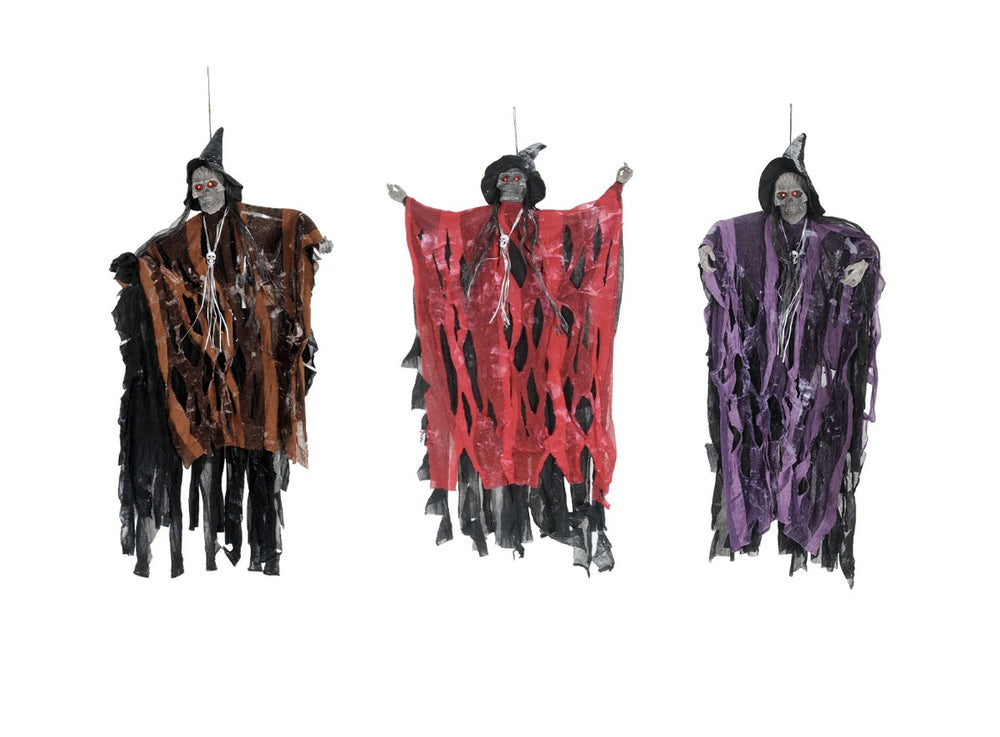 Includes: 1 x Animated Hanging Skeleton Witch Decoration (random colour)
