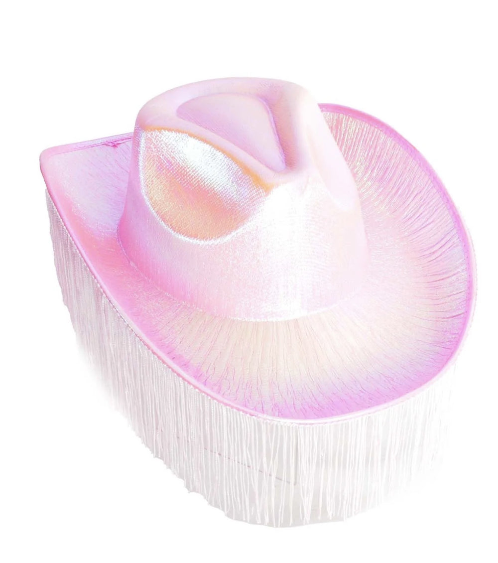 LIGHT PINK METALLIC COWBOY HAT WITH FRINGE