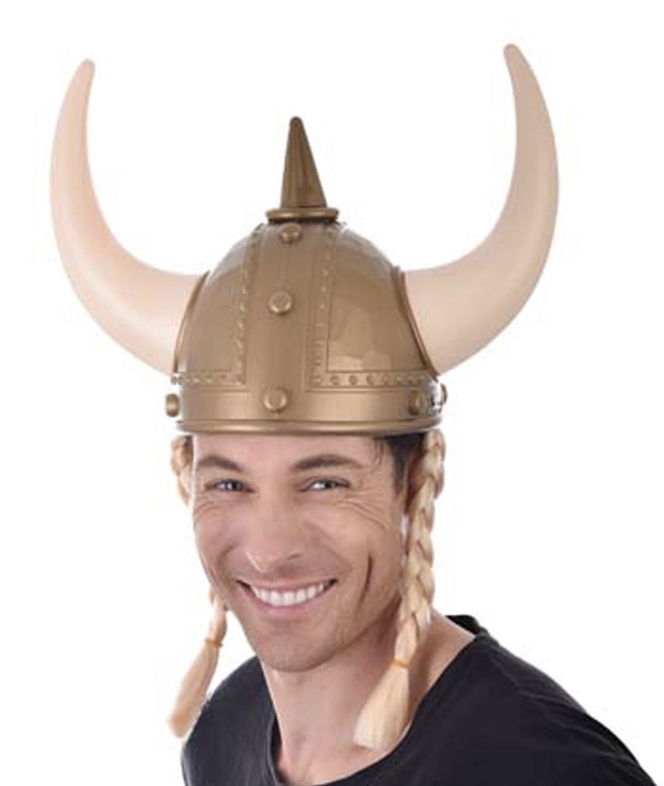 Be the leader of the Vikings with this Viking Helmet with Plaits. This plastic gold helmet includes blonde Viking plaits.