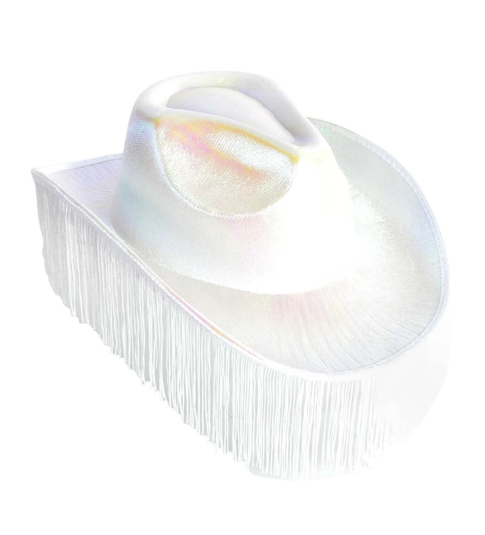 WHITE METALLIC COWBOY HAT WITH FRINGE