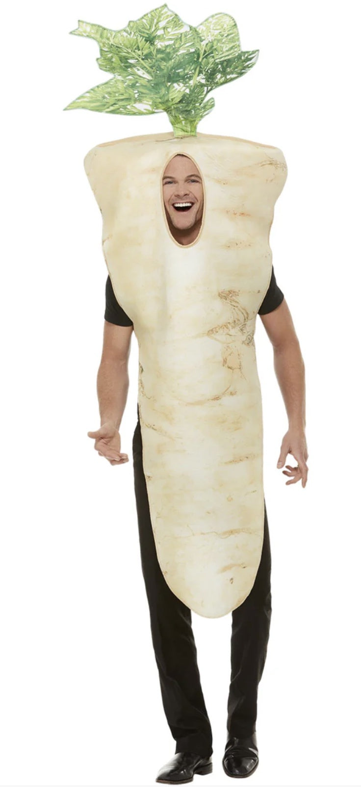 Be the root of all laughter when you wear this Parsnip Adult Costume. This hilarious tabard features a realistic photo print of a parsnip, complete with a vibrant green leafy stem sprouting at the top. With an opening for your face and a plain back, it's easy to wear and perfect for stirring up giggles at any event. Whether you’re vegging out or stealing the spotlight, this costume is sure to turnip the fun.