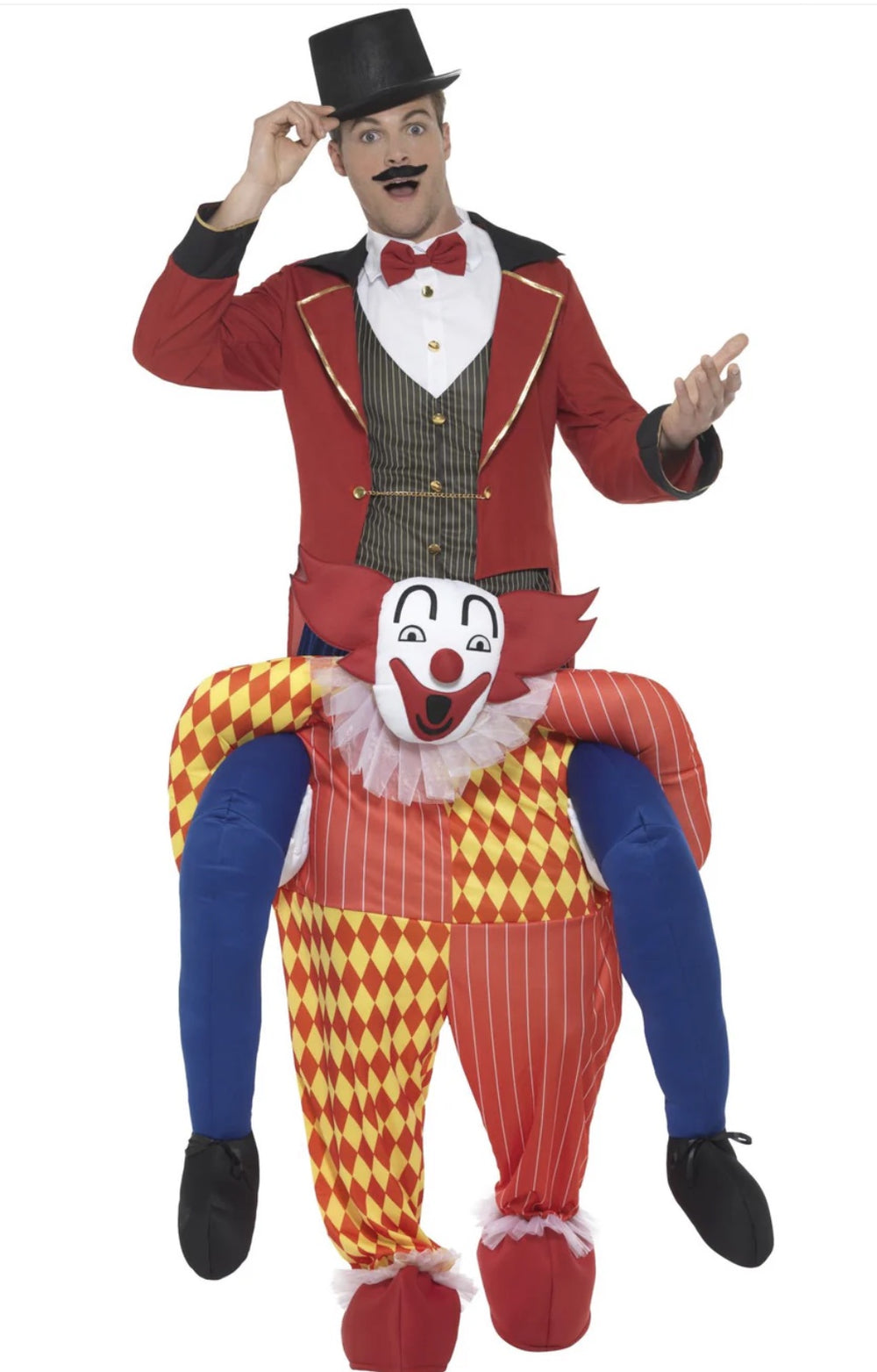 Our Piggyback Clown Costume is the perfect comedy fancy dress costume. Featuring a classic clown base, this one piece costume comes completer with mock legs. Please note the ringmaster costume isn't part of the one piece suit and can be purchased separately.