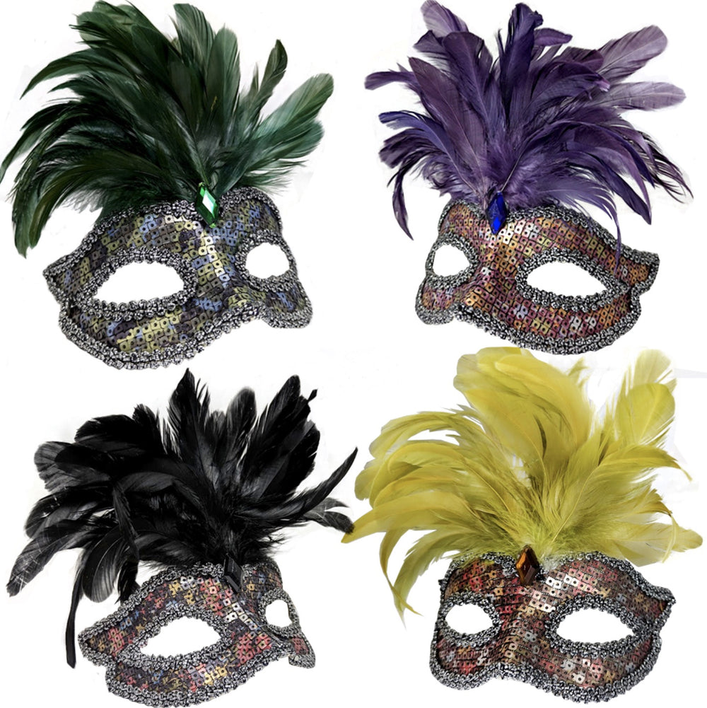 ASSD SQUARE SEQUIN MASK W/GEM & FEATHERS