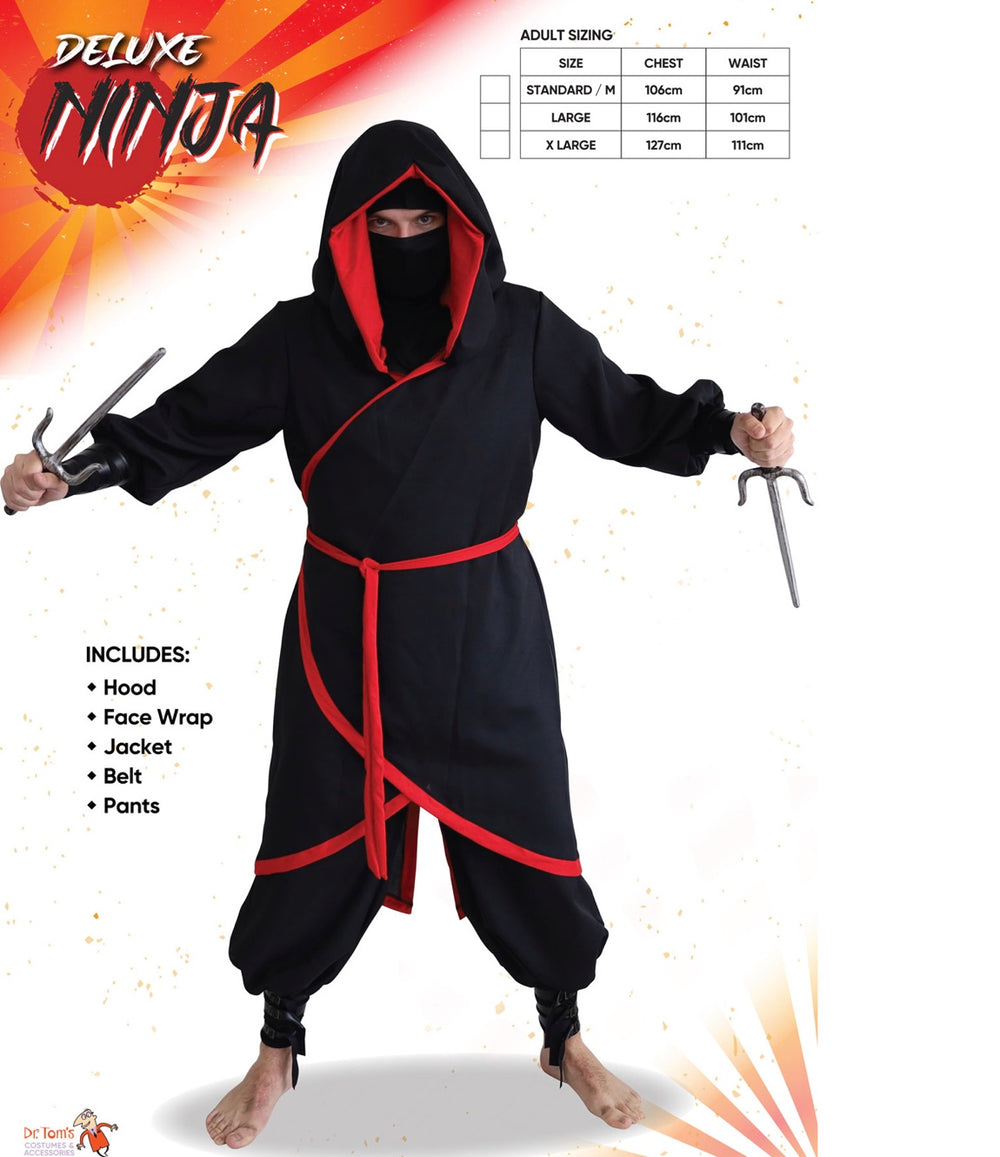 Strikes fear into the hearts of your enemies with this Deluxe Ninja Adult Costume! Featuring a hood and face wrap you will be a master of stealth with this ensemble. Look effortlessly cool and charming as you search for the perfect Halloween shenanigans! Become the ninja legend you were meant...