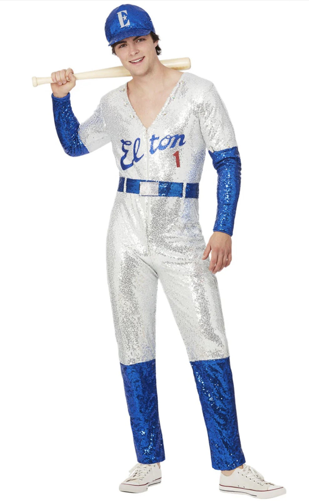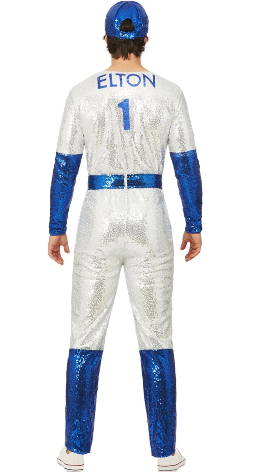You'll certainly hit a home run in this Elton John Sequin Baseball Deluxe Mens Costume. This fun costume is inspired by the one that Elton John wore in 1975 for his concert at Dodger Stadium. The costume comes with a silver sequin jumpsuit featuring blue sequin panels on the sleeves and legs, "Elton" in blue cursive across the chest, "Elton" and a number "1" in blue capitals across the back, and has a front zipper for closure. Also included is an adjustable blue sequin belt with a hook and loop fastener, as well as a blue sequin baseball-style cap with a silver "E" at the front. Add your own shoes and sit yourself down at the piano and you're ready to serenade your party guests in style. Perfect for celebrity themed parties, 70s parties, sport themed parties and more.