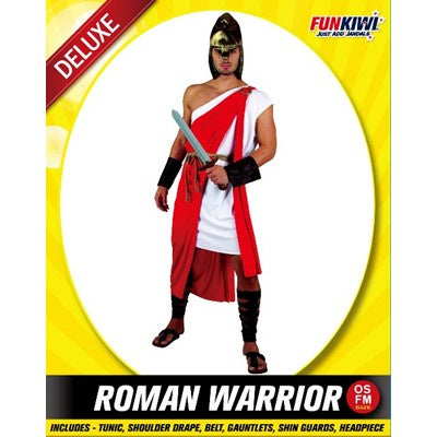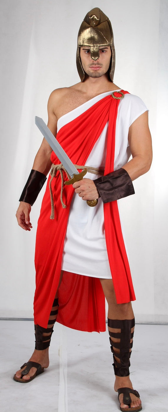 This Roman Warrior costume includes a tunic, shoulder drape, belt, gauntlets, Shin Guards, headpiece.