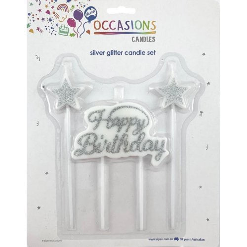 Fabulous silver glitter candle set in the Alpen Occasions Candle range. This set includes 1 Happy Birthday plaque and 2 stars