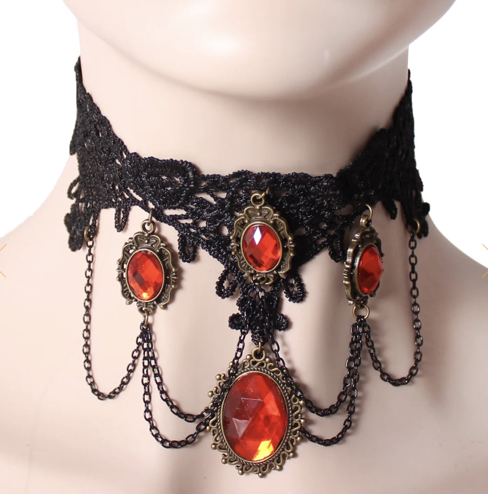 This Blood Ruby Lace Choker Accessory is going to take your Halloween costume to the next level Its intricate black lace design design looks elegant on the neck and is offset by beautiful blood red gems with complimentary swooping chains interconnecting each one. Perfect to dress up as a witch, vampire, dark mage and more!