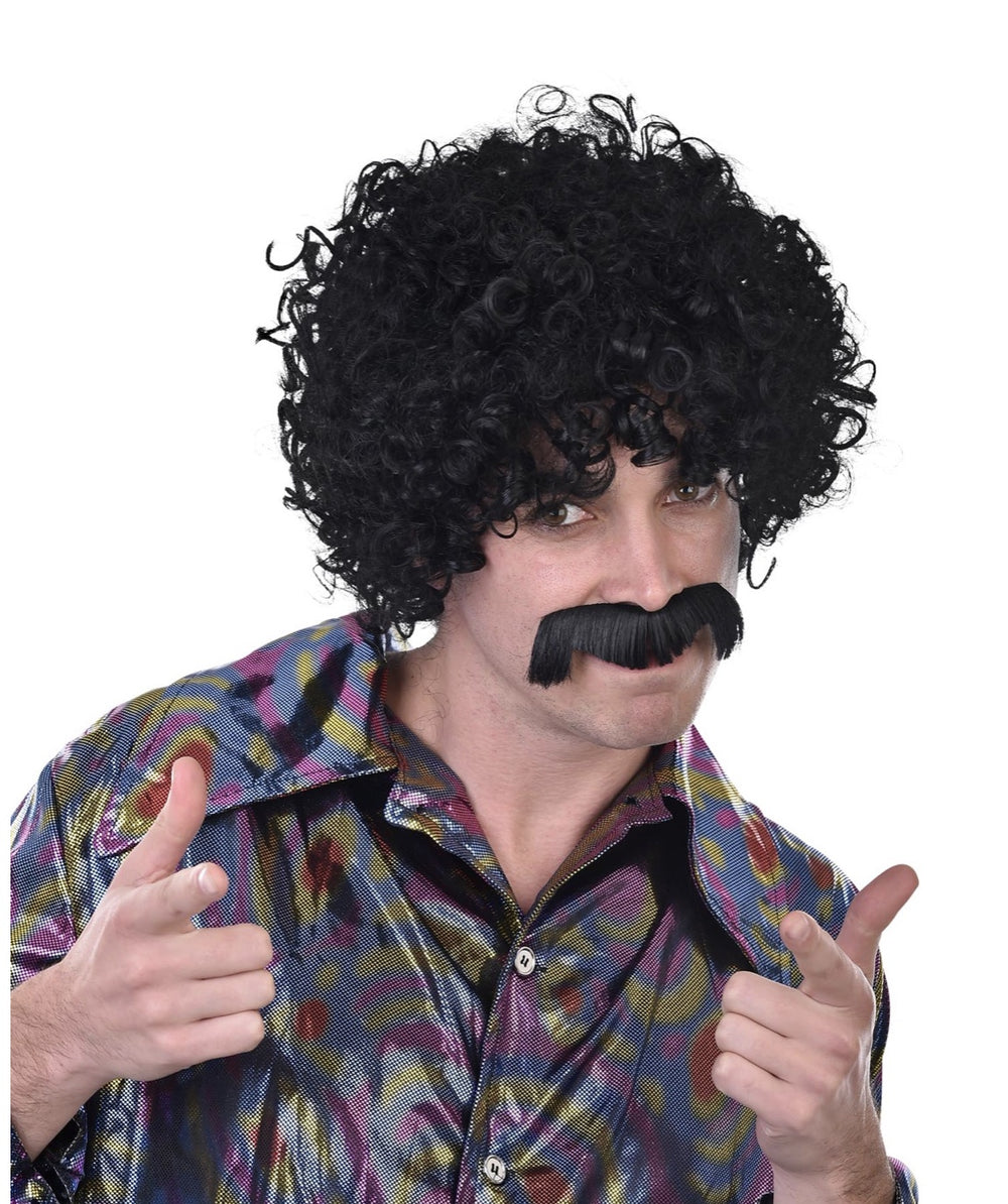 Crafted with love and nostalgia, this set includes a lusciously tight-curl black afro wig that screams disco fever! Get ready to flaunt those curls like you’re starring in your very own Saturday Night Fever remake. And that’s not all – accompanying this fabulous fro is a matching black handlebar mustache that’ll have you looking like the king of the disco era in no time.