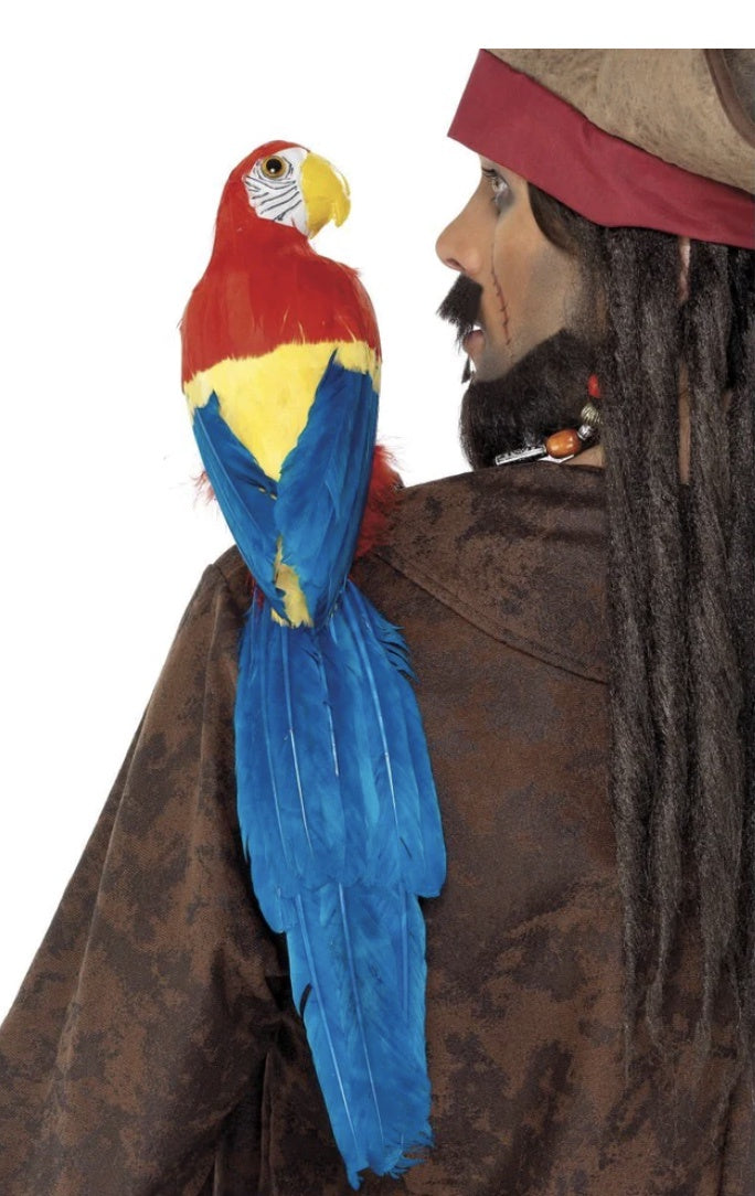 AYE AYE Captain! Complete your Pirate look with our Lifelike Parrot With Elastic holder This great accessory to any pirate costume comes with a brightly coloured Parrot made out of colourful fake feathers. The Parrot is 20 inches / 50 cms in length and has elastic to loop your arm through so the parrot sits on your shoulder