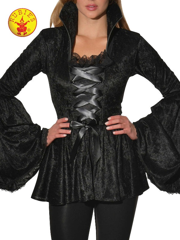 - Crushed velvet, long sleeved corset top with feature trumpet sleeves and high collar