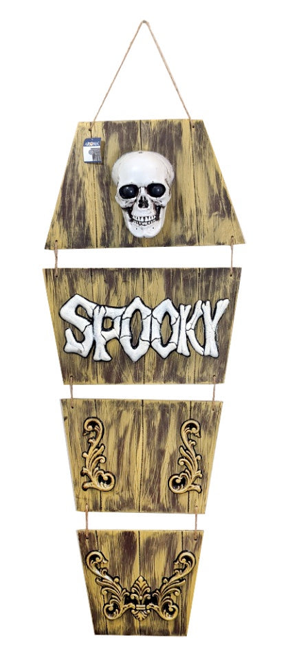 Welcome your guests into your haunted house party with this spooky skeleton animated hanging Halloween decoration! Perfect for hanging on a door, this coffin-shaped prop activates when it is moved. Watch in delight as your friends get a fright when the skull opens its eyes, moving them around and playing creepy sounds and music!