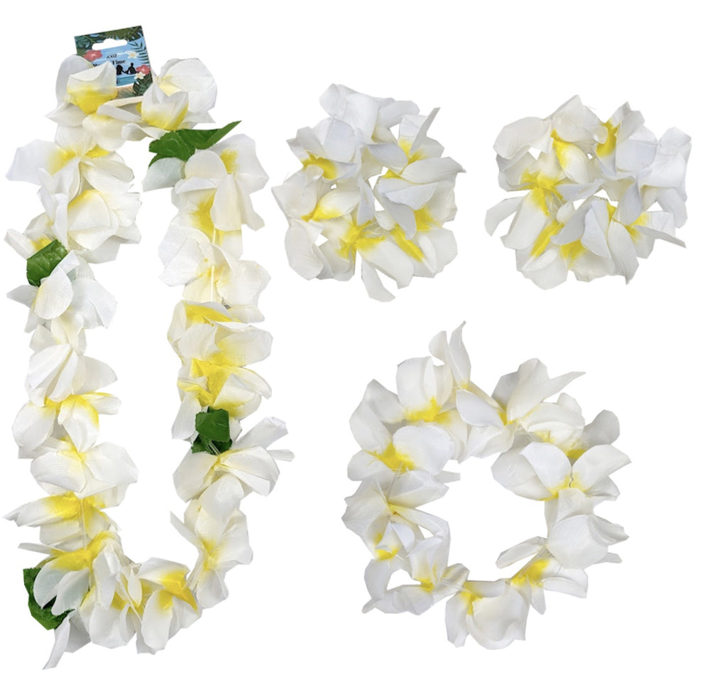 WHITE FRANGIPANI LEI, HEADBAND & BRACELET SET W/ HANG TAG