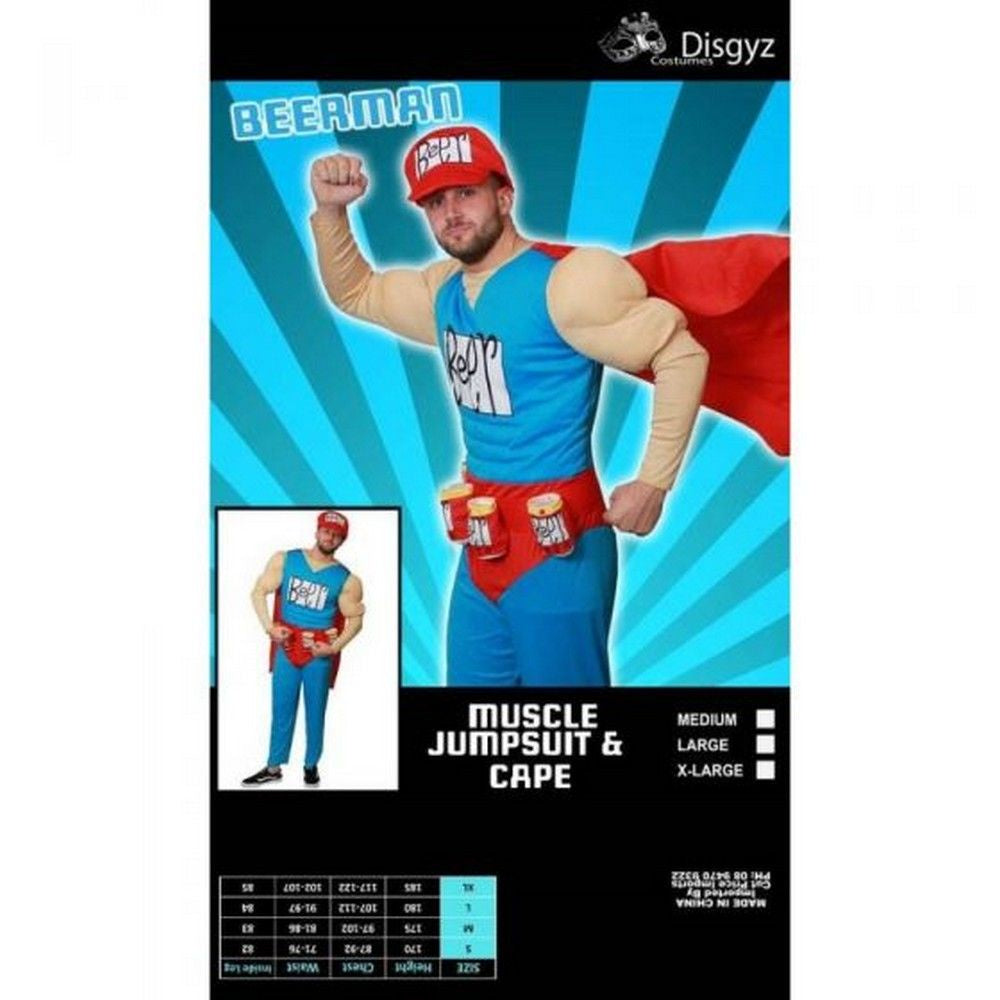 Duffman from the Simpsons costume contains muscle jumpsuit, hat and cape
