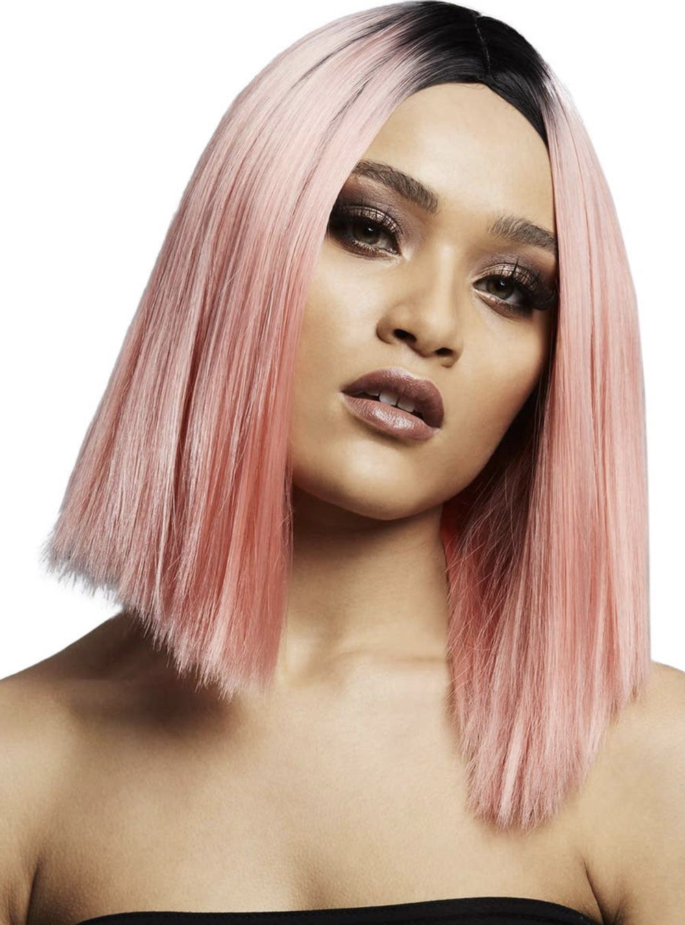 Blunt Cut Womens Coral Pink Bob Wig with Dark Roots