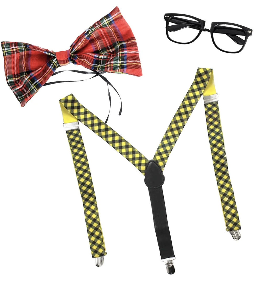 Transform into the ultimate 1950's brainiac with our Retro Nerd Kit! This 3-piece ensemble includes classic black-rimmed glasses, a snazzy red tartan bow tie, and eye-catching yellow checkered suspenders—everything you need to nail that authentic mid-century geek chic. Perfect for themed parties, Halloween, or whenever you feel like embracing your inner smarty-pants! Just add high-waisted pants or skirt and a white shirt, and you'll be the most authentically dorky cat at the sock hop.